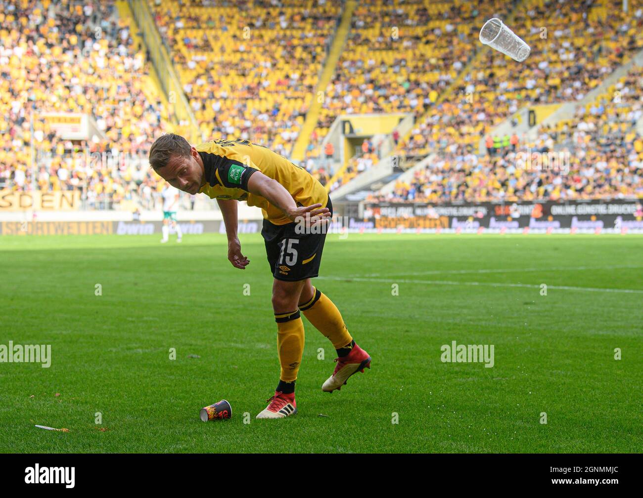 Dresden Germany 26th Sep 2021 Football 2 Bundesliga Sg Dynamo Dresden Sv Werder Bremen Matchday 8 Rudolf Harbig Stadion Dynamo S Chris Lowe Throws A Beer Mug And A Cup Of Curry Sausage From